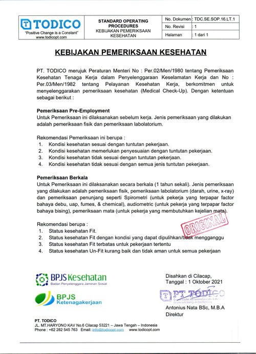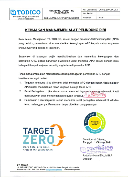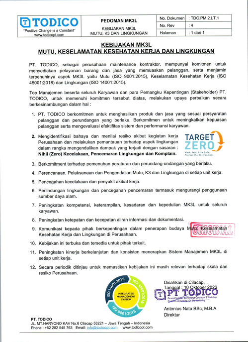KEBIJAKAN MUTU, KESELAMATAN DAN KESEHATAN KERJA DAN LINGKUNGAN (MK3L) - PT. TODICO